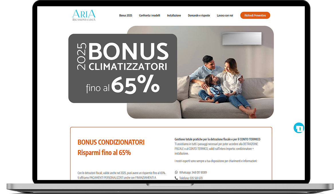 Per raggiungere questi obiettivi, abbiamo sviluppato una landing page dal design moderno e accattivante, con un’attenzione particolare alla user experience e alla conversione. L’interfaccia utente è stata progettata per guidare i visitatori attraverso un percorso logico e intuitivo, mettendo in evidenza i punti di forza di Aria Rigamonti e i vantaggi per i clienti. Abbiamo curato particolarmente i contenuti, rendendoli chiari, concisi e persuasivi.