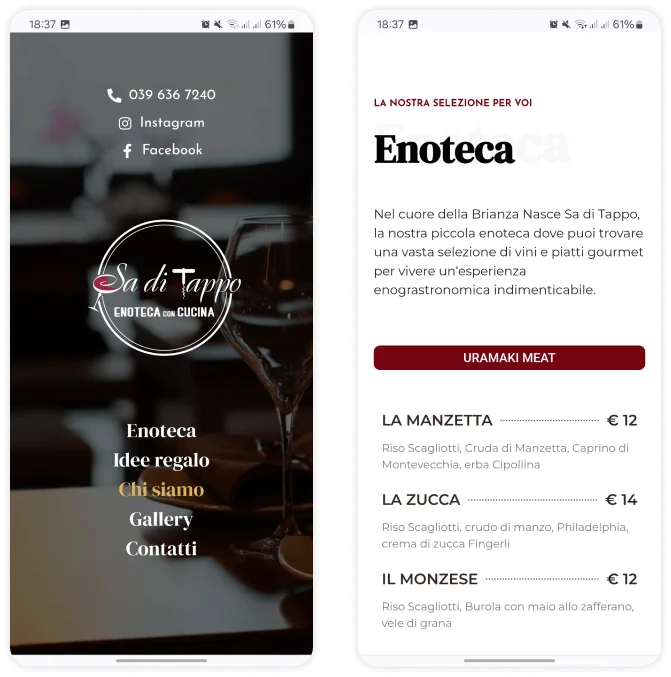 Creare una presenza online invitante e informativa che riflettesse l’atmosfera calda e accogliente di Sa Di Tappo, presentando in modo appetitoso il menu, l’ambiente suggestivo e la filosofia dell’azienda, incoraggiando i visitatori a prenotare un tavolo o a contattare per eventi speciali.