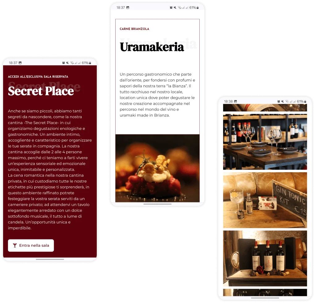 Design: Ho scelto una palette di colori caldi e naturali, che richiamano i paesaggi della Brianza e l’atmosfera accogliente del casolare. Le immagini del locale e dei piatti sono state realizzate con cura, mettendo in risalto la bellezza degli ambienti e la presentazione invitante delle pietanze.